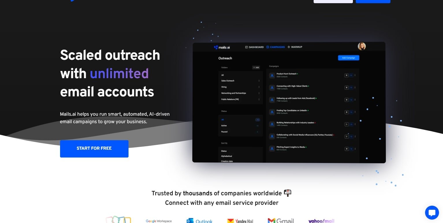 Mails.ai is an AI-powered tool that helps businesses automate and improve their email outreach campaigns. It allows you to connect unlimited email accounts, automate campaigns, and use AI to write effective emails. This tool optimizes email sending patterns to increase deliverability and responses, saving time and boosting revenue for your business.