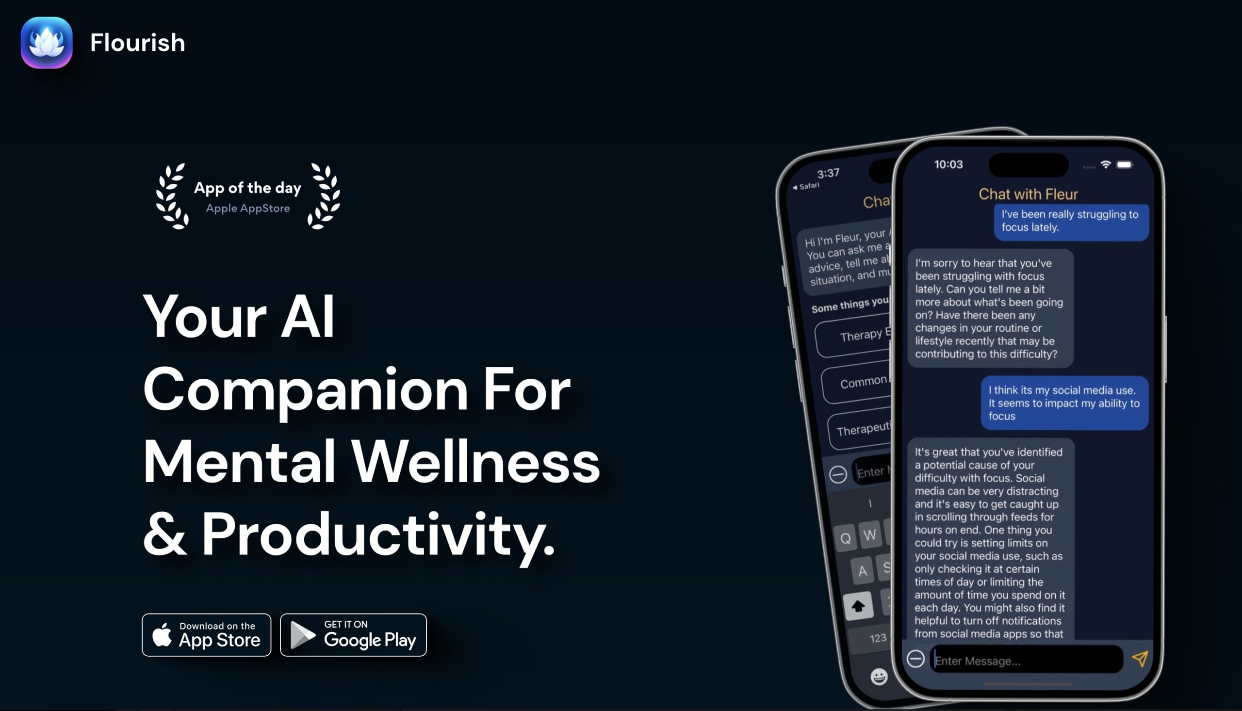Flourish: Your AI Mental Wellness & Productivity Companion. Engage in conversations, get mental health assessments, and find relaxation tools. Access quality support.