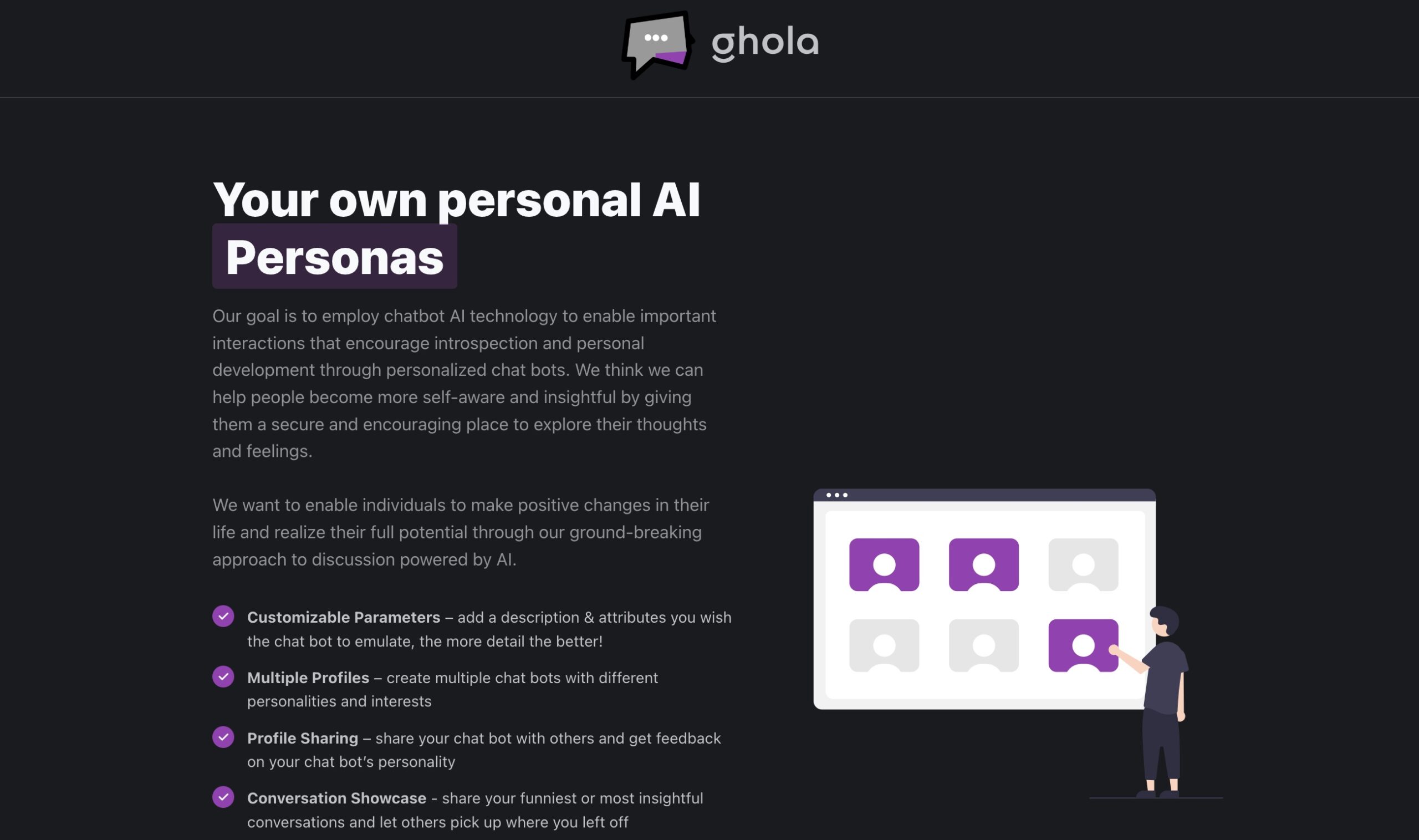 Our platform empowers users to craft AI-powered chatbot personas tailored to specific attributes and interests. With a focus on encouraging introspection and personal development, users can create, share, and engage with diverse chatbot personalities. The platform’s upcoming group conversation feature promises interactive multi-bot discussions, while the beta API facilitates integrating these chatbots into external projects.