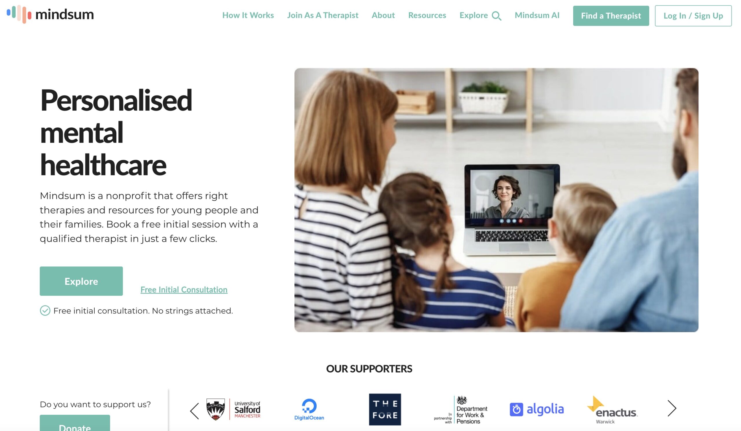 Mindsum is a non-profit organization that uses technology to provide holistic, human-centric mental healthcare for children and young people. They offer information and connect individuals with therapists, with all profits going towards therapy for those in need.